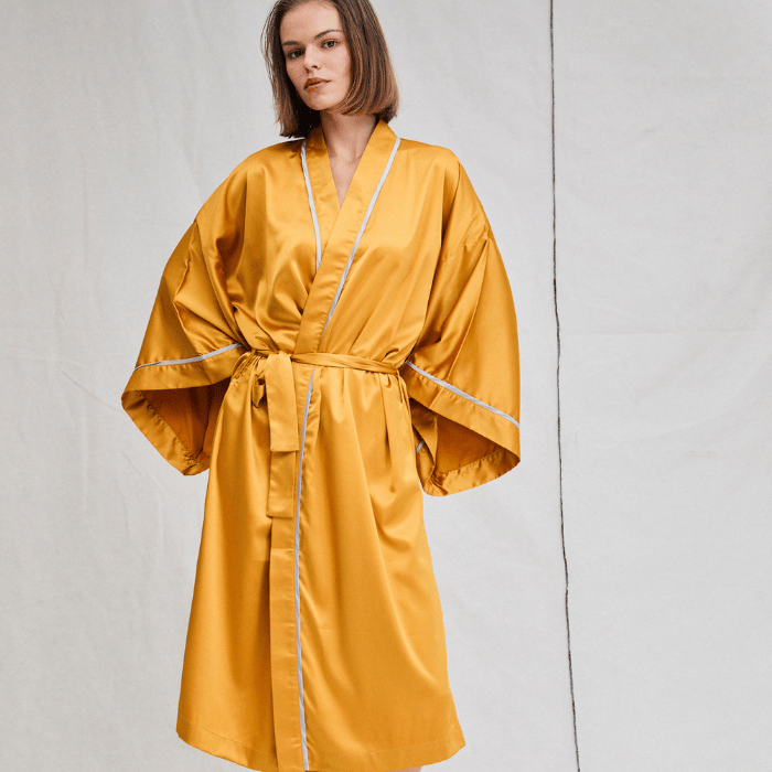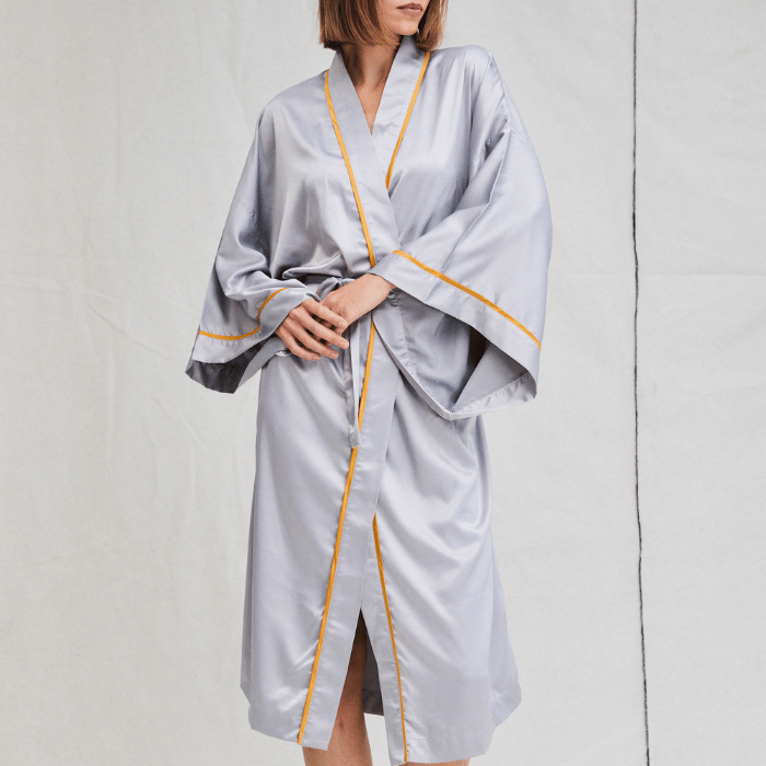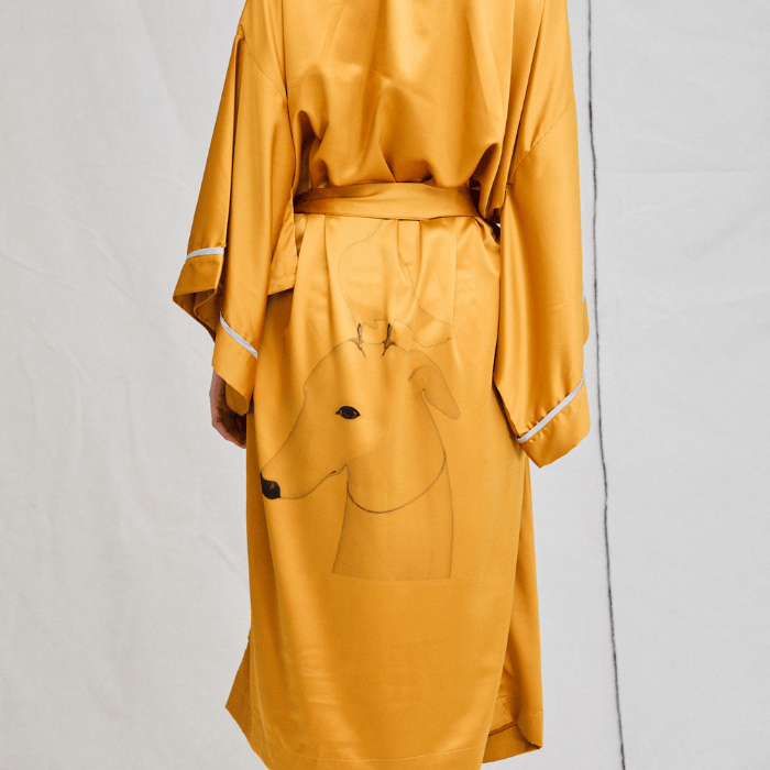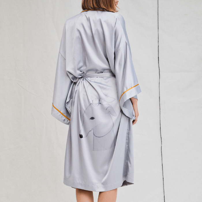 Imagina envolverte en esta bata de seda y sentir la suavidad y el lujo contra tu piel. El detalle de los vivos y el estampado de animales en la espalda le da un toque único y encantador, perfecto para esos momentos en los que quieres sentirte especial. Disponible en colores gris y ocre, esta bata es ideal para relajarte en casa con estilo y elegancia.